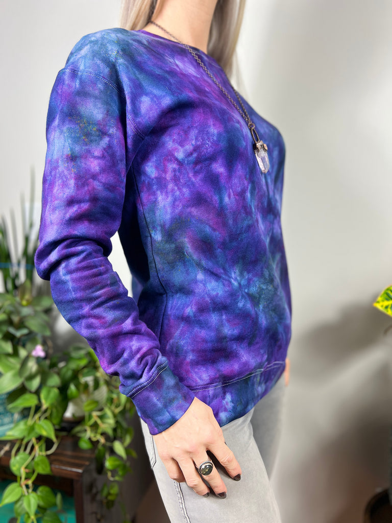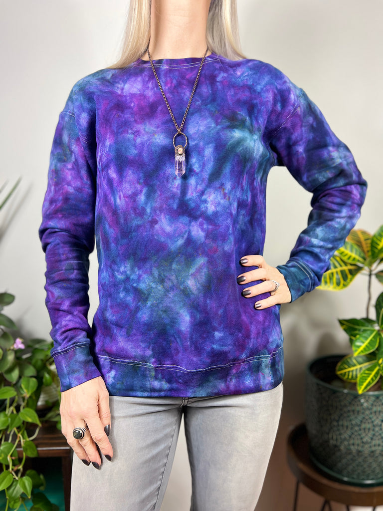 The fabric is a thick cotton sweat shirt knit, with a soft fleece lining. This style is hand-dyed in a variety of colors using special dyeing techniques. Each piece is one of a kind, you will never see another quite the same. We have used permanent fiber reactive dyes, so the colors are permanently fixed in the fabric and will not fade or bleed.
