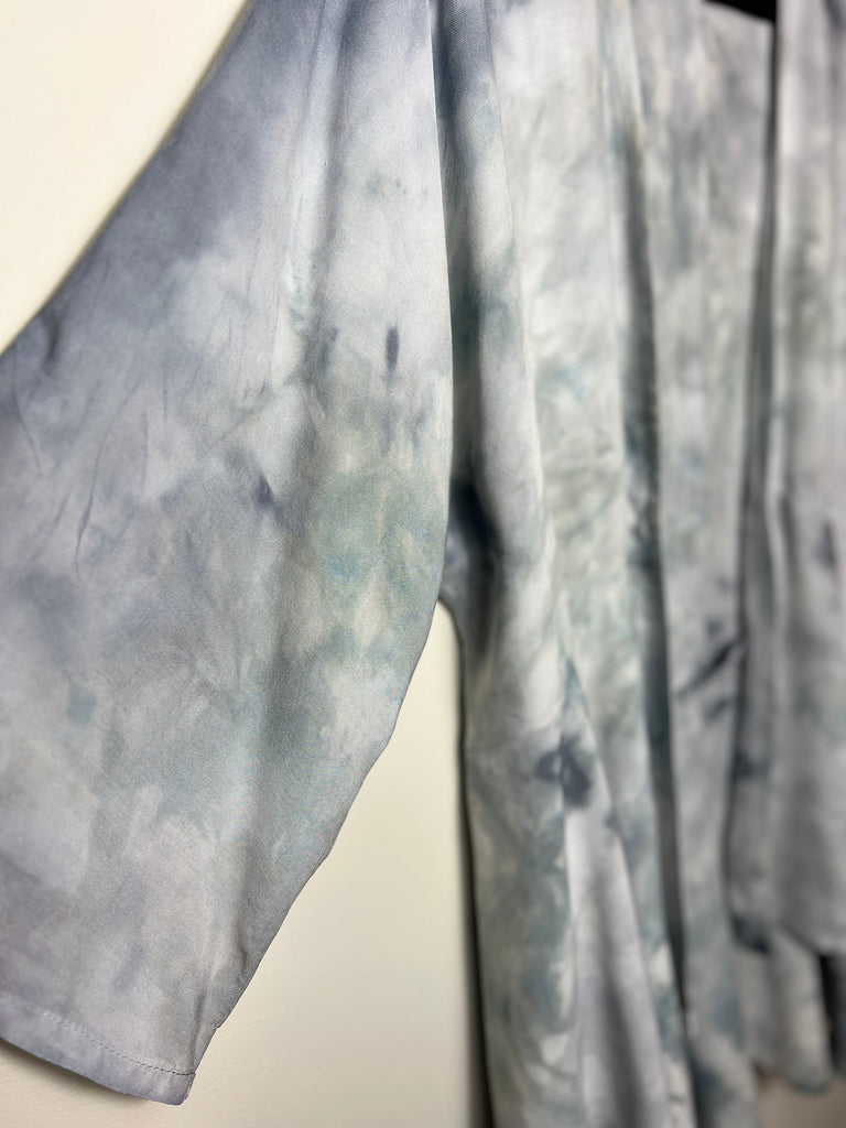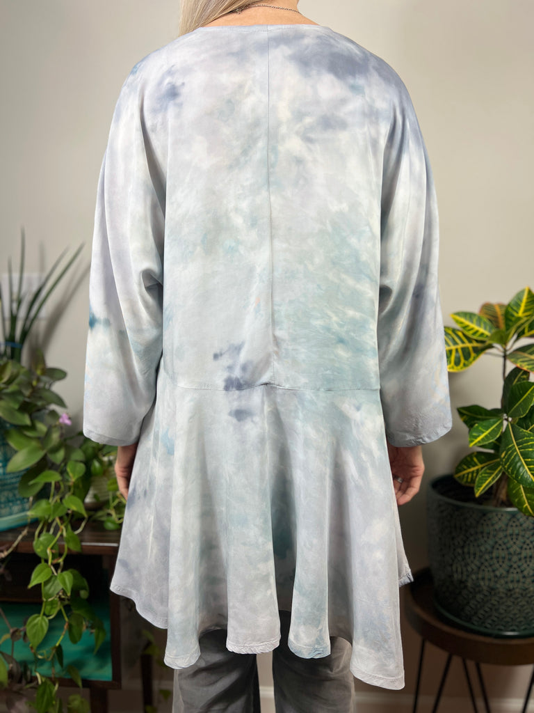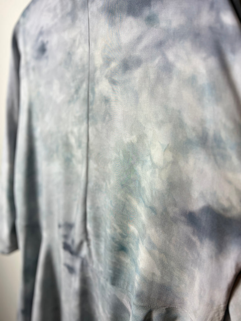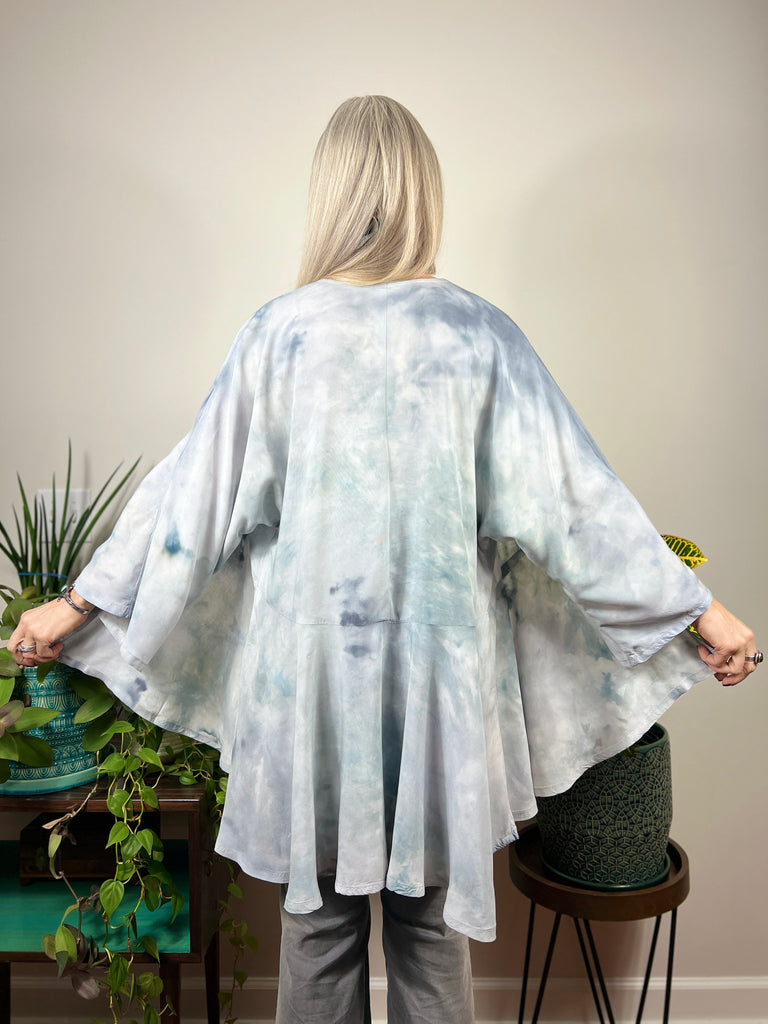 The woven fabric is a soft rayon , giving a gorgeous flowing drape. These are individually dyed in our studio using special dye techniques. Each piece is one of a kind, colors & patterns will vary and you will never see another quite the same. We have used permanent fiber reactive dyes, so the colors are permanently fixed in the fabric and will not fade or bleed.